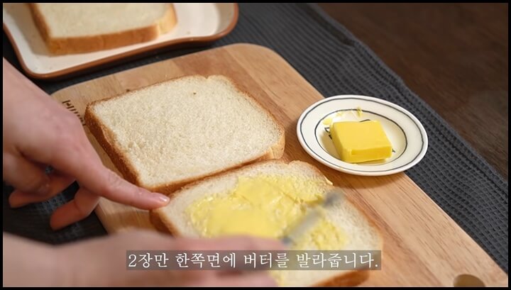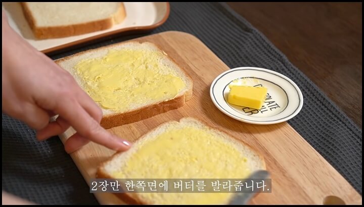 2. 식빵 3장 중 2장에만 한쪽 면에 버터를 발라줍니다.