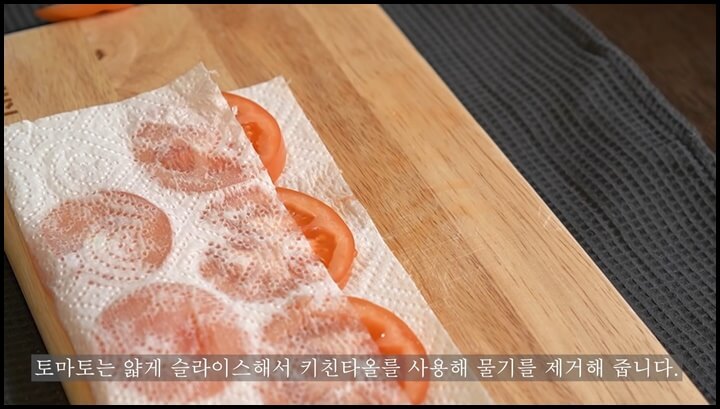 6. 토마토는 얇게 슬라이스해서 키친타올에 감싸 물기를 제거해 줍니다.