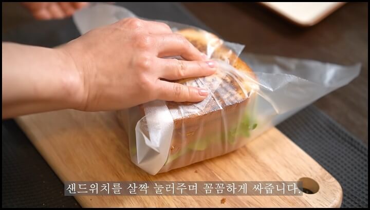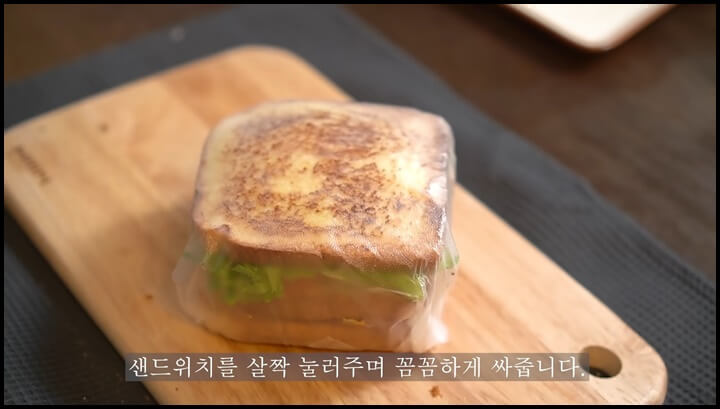 12. 랩을 깔고 샌드위치를 올려서 살짝 눌러가며 꼼꼼하게 싸 줍니다.