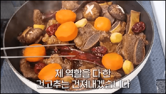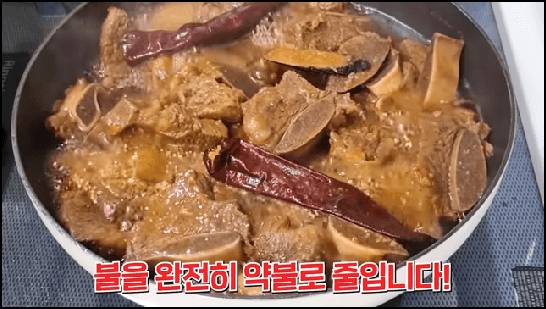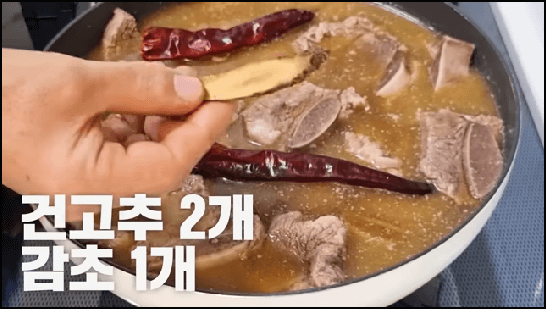 만든 양념장에 소갈비를 모두 넣고 물 1리터, 건고추 2개, 감초 1개를 넣고 끓여줍니다. 건고추를 넣으면 느끼한 맛을 잡아주고, 감초는 감칠맛을 더해 주어 입맛을 끌어올려 줍니다. 뚜껑을 덮고 끓여주는데, 끓어오르는 시점부터 40분 정도 중불에서 뭉근하게 끓여줍니다. 강불에서 끓이면 고기가 질겨지기 때문에 중불에서 뭉근하게 끓여줍니다. 그래야 고기가 부드럽습니다.