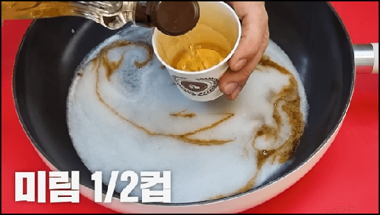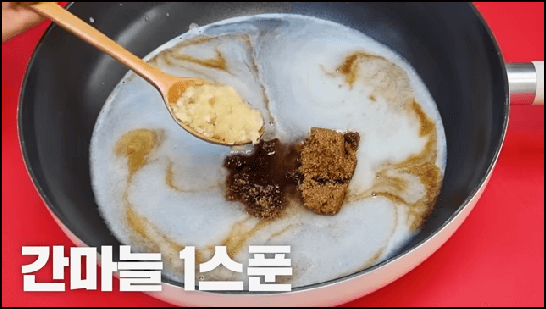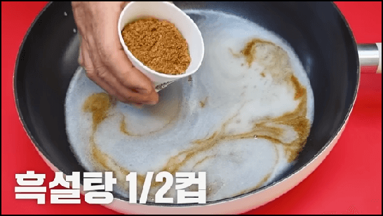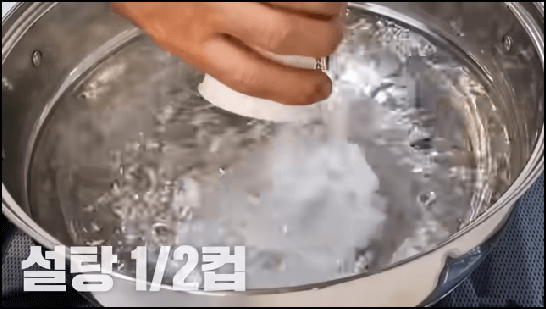 냄비에 물 1.8리터를 끓이고 설탕 1/2컵을 넣어 잘 녹여줍니다. 설탕을 넣고 초벌 삶기를 하면 삼투압작용으로 핏물도 잘 빠지고 고기도 더 맛있어집니다.