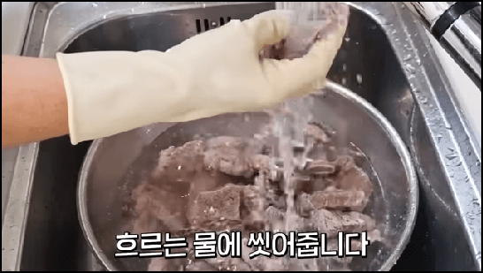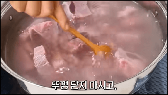 뚜껑을 닫지 말고 그대로 열어둔 채 끓는 시점부터 5분 정도 삶아줍니다. 삶은 고기는 누린내가 나지 않도록 찬물에 씻어줍니다. 흐르는 물에서 깨끗하게 씻어줍니다.