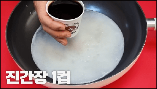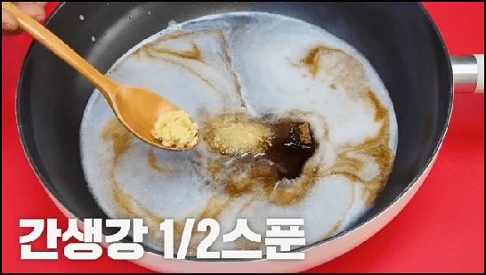 여기에 진간장 종이컵 1컵, 미림 1/2컵, 흑설탕 1/2컵, 간마늘 1스푼, 간생강 1/2스푼을 넣어서 잘 섞어줍니다.