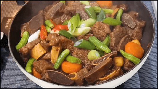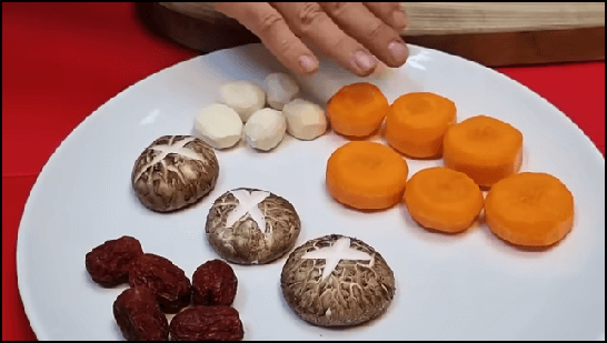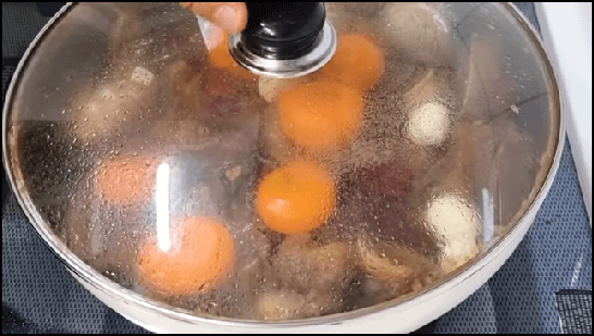 40분 정도 충분히 익힌 소갈비는 불을 완전히 약불로 줄인 후 준비한 당근, 밤, 대추, 표고버섯을 넣고 뚜껑을 덮어줍니다. 그리고 약불에서 30분 정도 더 끓여줍니다.