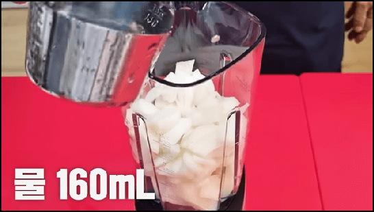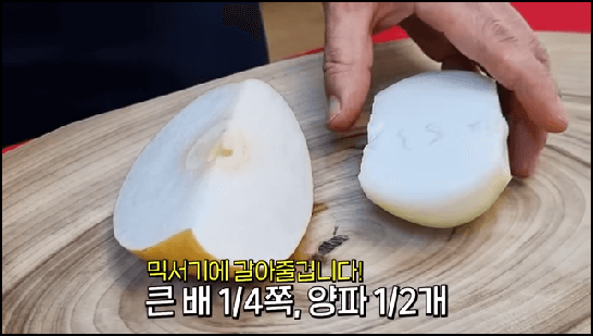 소갈비찜 황금레시피로 만드는 양념입니다. 먼저 배 1/4쪽과 양파 1/2개를 적당한 크기로 썰어 믹서기에 갈아줍니다. 믹서기에 간 것을 베 보자기에 넣고 꼭 짜서 즙을 내 줍니다. 그러면 깔끔하고 시원한 양념이 만들어 집니다.