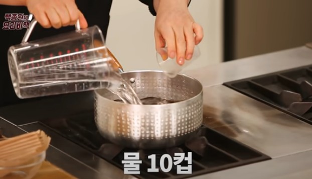 불을 켠 후 물을 10컵 부어줍니다. 물은 간장의 10배 비율로 잡으면 돼요. 끓어오르면 불을 중약불로 줄인 후 뭉근하게 50분 정도 끓여줍니다. 바글바글 끓이는 것이 아닌 보글보글의 느낌으로 뭉근하게 푹 끓여주면 됩니다.