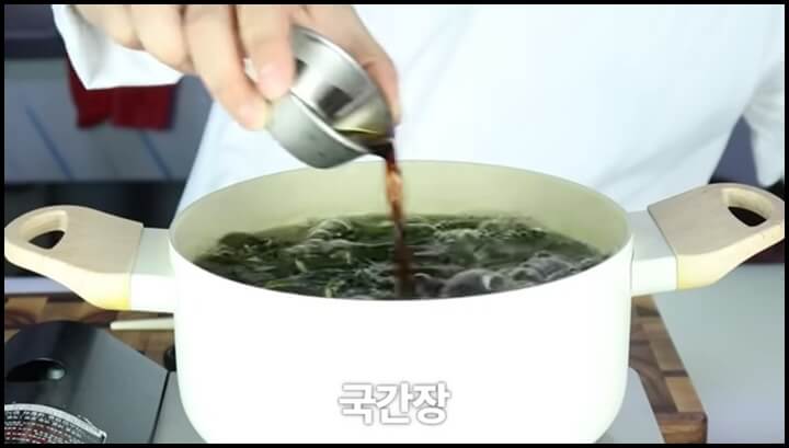 미역국이 끓으면 국간장을 넣어주는데요, 국간장 양은 딱히 정해지거나 기억할 필요없이 이 정도 색이면 되겠다 싶을 정도로만 넣어주시면 됩니다.