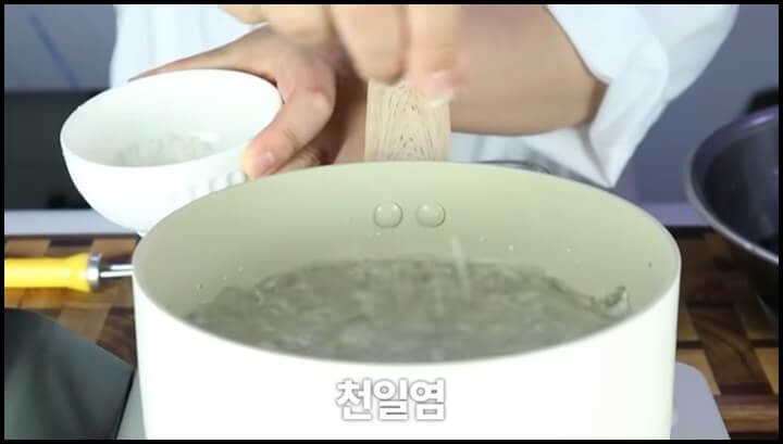 냄비에 고기 양의 3배 정도 되는 물을 넣고 끓여줍니다. 물이 끓기 시작하면 천일염을 조금 넣어주고, 고기를 데쳐주는데요, 고기 데치는 시간은 15~20초입니다. 고기를 넣고 나서 끓지 않더라도 시간이 되면 그냥 건져주시면 됩니다.