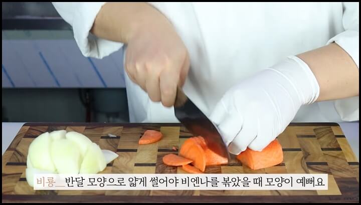양파는 깍뚝 썰기로 썰어주고, 당근은 반달모양으로 썰어줍니다. 당근을 반달모양으로 썰어주면 소세지 야채볶음을 했을 때 모양이 이쁩니다.
