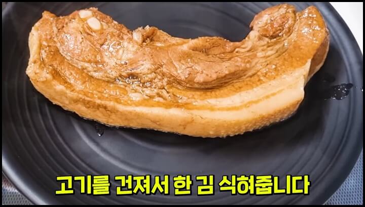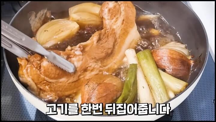 1) 삶아진 고기를 건져내어 한 김 식혀줍니다.