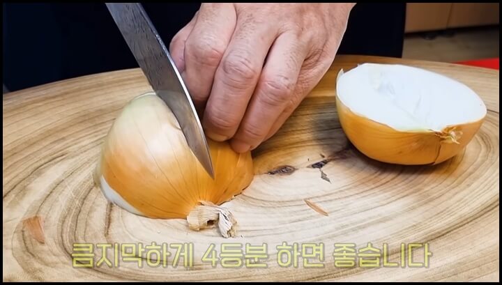 1) 양파 껍질채 잘 씻어서 뿌리쪽을 살짝 자른 후 큼직하게 4등분으로 잘라줍니다.