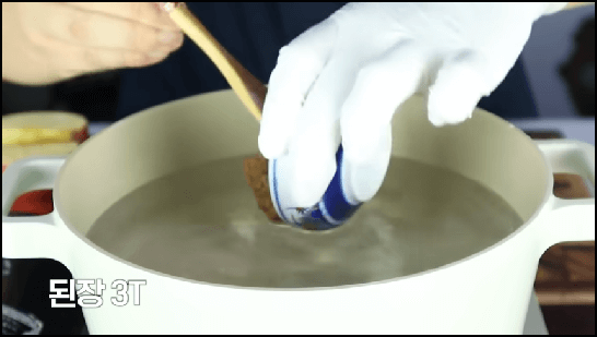냄비에 물 1.5리터를 넣고 된장 3큰술을 풀어줍니다. 그리고 진간장 3큰술, 매운 건고추 5개를 넣어줍니다. 건고추가 없다면 고추씨를 망에 넣어서 대신 넣어주어도 됩니다. 통후추 1큰술을 넣고, 사과, 양파, 대파, 통마늘 10알도 모두 넣어줍니다.
