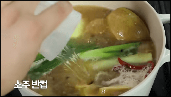 고기를 넣고 다시한번 팔팔 끓여줍니다. 그리고 소주 반컵을 넣어줍니다. 소주를 넣으면 고기의 잡내도 잡고 더 맛있게 만들어 주는 과정입니다.