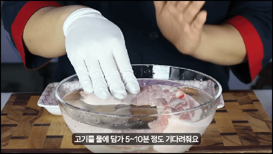 수육용 돼지고기를 바로 삶는 것보다 찬물에 담가 핏물을 잠깐 뺀 다음에 삶는 것이 잡내를 잡아주고 훨씬 더 맛있게 삶을 수 있습니다. 고기를 물에 담가 5~10분 정도 기다려 줍니다.