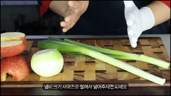 사과 1개는 가운데 씨를 제거하고 반으로 갈라서 준비합니다. 양파 1개는 자르지 않고 통으로 넣어줍니다. 잘라서 넣으면 흐물흐물해진 양파로 인해 지저분해 보일 수 있습니다. 대파는 냄비에 넣기 좋은 크기로 적당히 썰어줍니다.