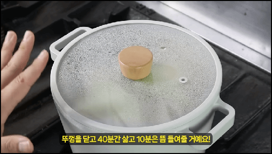 이제 뚜껑을 닫고 불을 낮춰주어야 합니다. 보글보글 끓을 정도로 불을 약불로 맞춰주고, 뚜껑 닫은채 40분간 삶아주고, 10분은 뜸을 들여줍니다. 강불에서 고기를 계속 삶으면 고기가 질겨지기 때문에 약불에서 고기를 삶아주어야 부드럽고 야들야들한 고기를 맛 볼 수 있습니다.