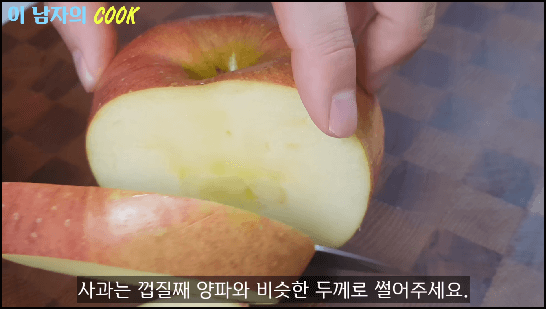 양파와 사과를 각각 1개씩 준비하는데, 만약 사과가 없다면 양파를 2개 준비하면 됩니다. 양파는 냄비 바닥에 깔기 좋도록 가로 방향으로 4~5등분으로 잘라줍니다. 사과는 껍질째 사용하고, 씨를 제외한 나머지 부분을 양파와 비슷한 두께로 잘라줍니다.