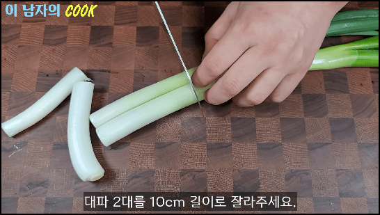 수육 맛있게 삶는법에 들어가는 부재료를 손질해서 준비합니다. 대파 2대는 약 10cm 길이로 잘라줍니다.