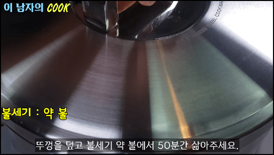 이제 냄비 뚜껑을 덮고 약불에서 50분 간 삶아줍니다. 불은 꼭 약불로 해서 삶아야 하니 불 조절 잘 하시고요, 뚜껑을 덮어서 50분간 푹 삶아주면 됩니다.