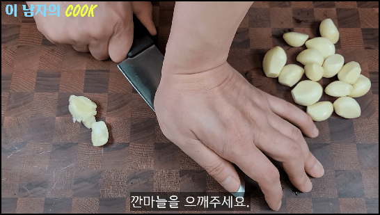 통마늘 10~12알을 준비하여 칼등으로 으깨 줍니다. 마늘의 주요 성분인 알리신은 마늘 세포가 파괴되었을 때 나오기 때문에 이렇게 으깨서 넣어주면 더 좋다고 합니다.