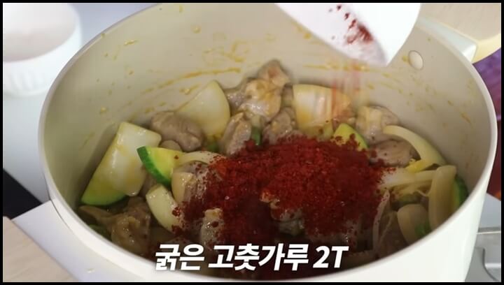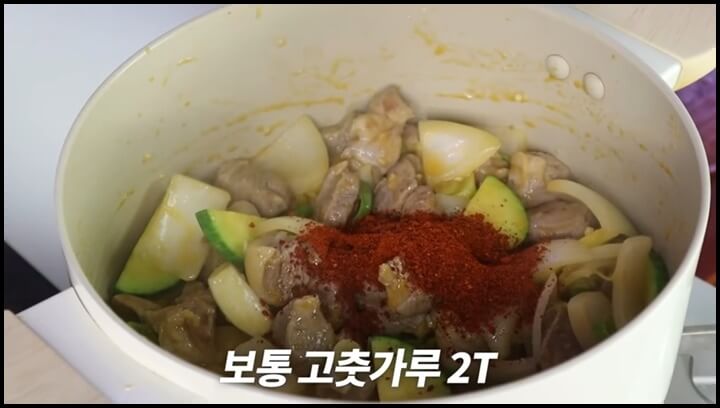 4) 고기가 50% 정도 볶아지면 수분이 적당히 생기는데, 이때 채소를 넣어줍니다. 양파, 애호박, 대파도 지금 같이 넣고 볶아서 파향을 확 올려줍니다. 청양고추도 넣어줍니다.