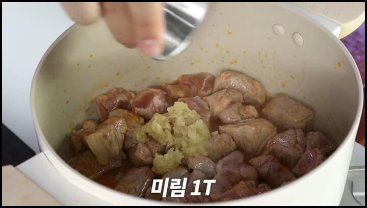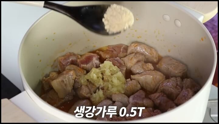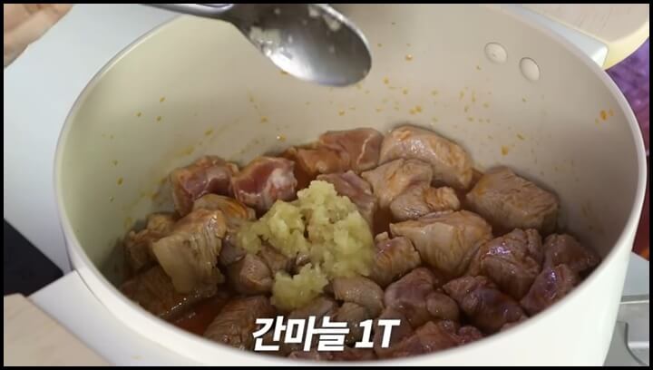 3) 고기가 기름코팅이 되듯 볶아졌으면, 간마늘 1큰술, 맛술 1큰술, 생강가루 0.5큰술을 넣어서 다시 볶아줍니다.