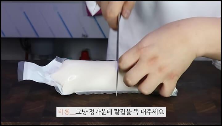 1) 순두부는 자를 때 정한가운데에 칼집을 내서 잘라줍니다. 그래야 순두부가 부서지지 않고 깔끔하게 빼 낼 수 있습니다.