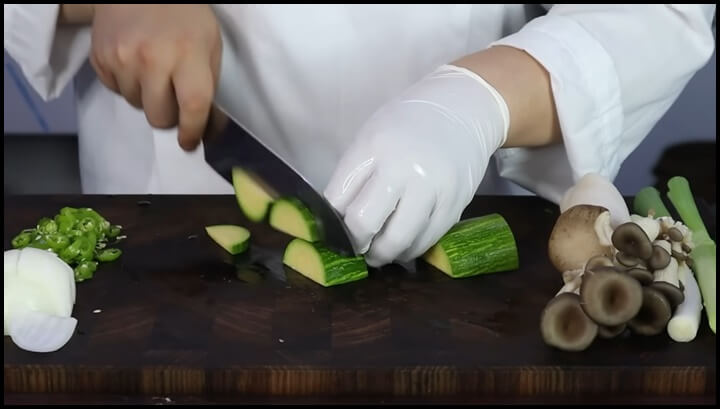4) 애호박은 반으로 갈라 반달모양으로 썰어주고,