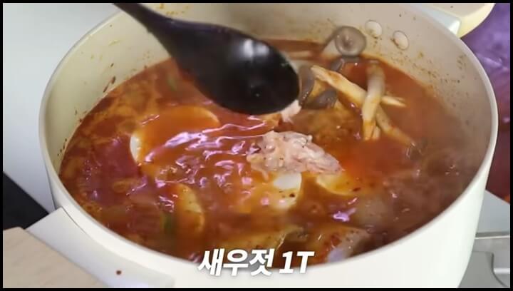 10) 버섯도 같이 넣어주고, 새우젓 1큰술을 넣어 감칠맛을 더해줍니다.