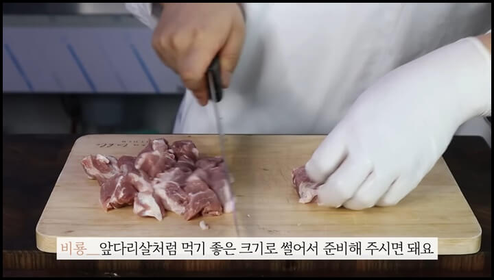 1) 앞다리살이나 목살을 먹기 좋은 크기로 썰어줍니다.