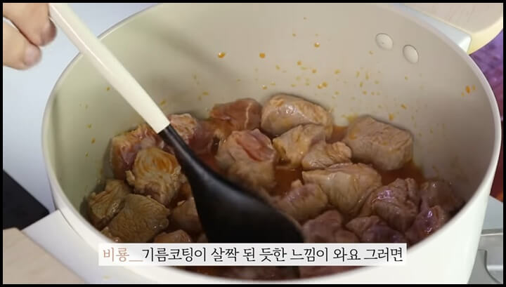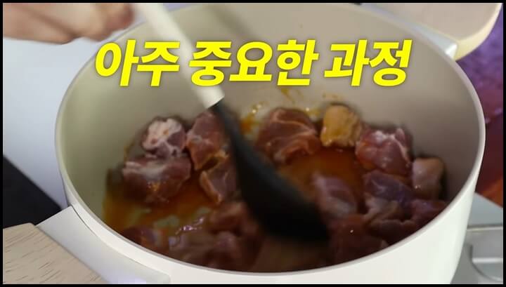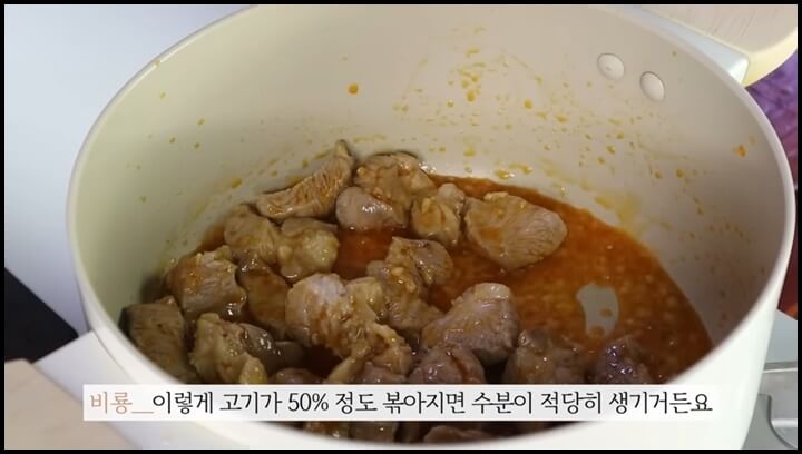 2) 약불에서 냄비와 기름을 달군 후에 고기를 넣고 달달 볶아줍니다.