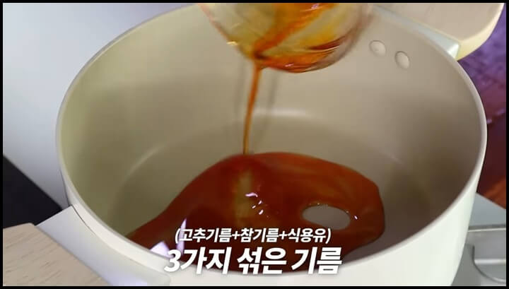 1) 먼저 냄비에 기름을 둘러줍니다. 앞서 만들어 두었던 고추기름+식용유+참기름 섞은 기름입니다.