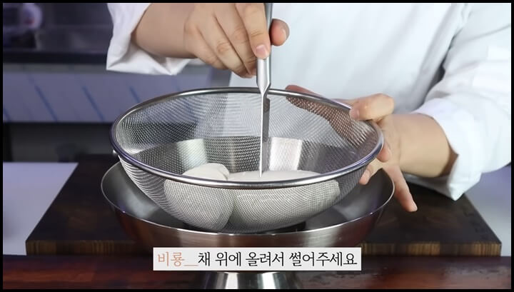 3) 이렇게 채반에 밭쳐서 순두부의 간수를 빼 주는데, 간수를 빼 주어야 순두부가 부서지지 않고 탱글탱글 탄력있게 모양이 유지됩니다.