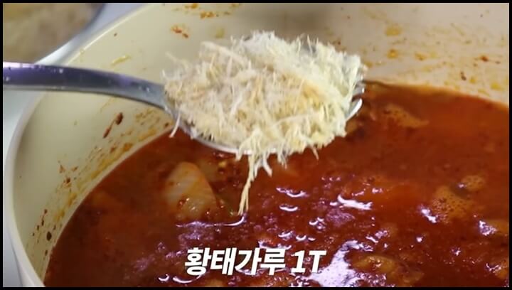 8) 여기에 참치액 2큰술을 넣고, 황태채 가루 1큰술을 넣어줍니다.