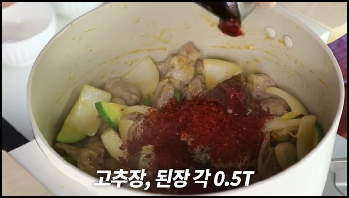 6) 고추장과 된장을 각각 0.5큰술씩 넣고 볶아줍니다.