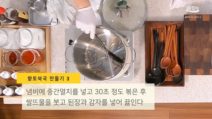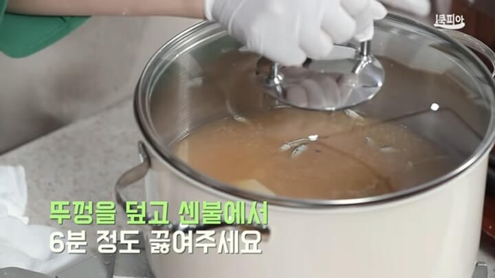 멸치는 중간 멸치라서 따로 건져내지 않고 같이 먹도록 해요. 그래서 중간 멸치를 사용하는 거라고 해요. 뚜껑을 덮고 센 불에서 6분 정도 끓여줍니다.