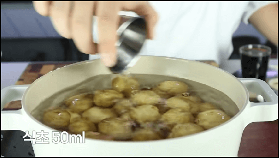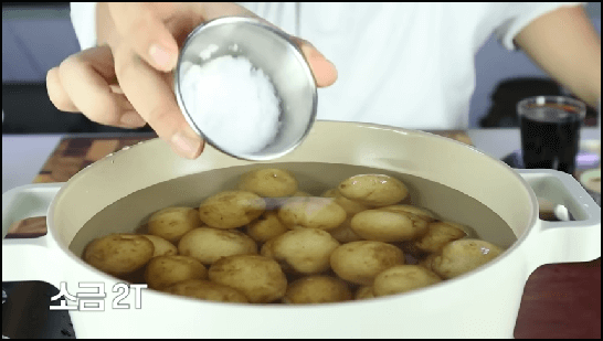 물에 깨끗이 세척한 알감자이지만 혹시나 남아있을 이물질과 흙들을 더 깨끗이 제거해 주기 위해 2차 세척을 해 줍니다. 냄비에 알감자를 모두 넣고 물을 잠길정도로 넣어줍니다. 그리고 소금 2큰술과 식초 50ml를 넣어서 그대로 끓여줍니다. 이렇게 해 주면 햇감자의 떫은 맛과 혹시 모를 이물질을 쉽게 제거할 수 있습니다.