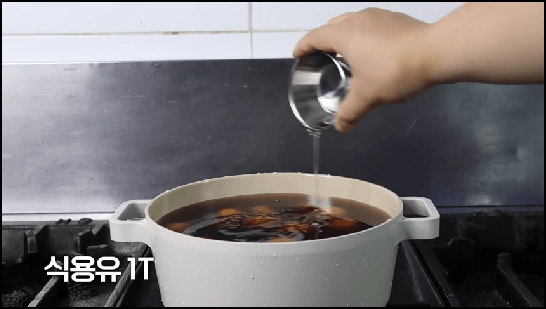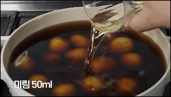 황색 물엿 5큰술, 미림 50ml, 흑설탕이나 갈색설탕 1큰술을 넣어줍니다. 그리고 껍질을 부드럽게 해 줄 비법 양념, 바로 식용유 1큰술을 넣어줍니다. 식용유를 넣어주게 되면 감자 속과 껍질이 겉돌지 않고 부드러워져서 껍질째 먹어도 아주 맛있답니다.