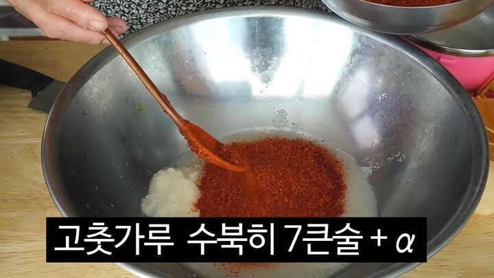 고춧가루 수북하게 7큰술을 넣고, 고추청 2큰술을 넣어줍니다. 고추청은 숙성된 고추 향과 깊은 단맛을 내주는데요, 만약 고추청이 없다면 건고추 4~5개를 물에 불려서 믹서기에 거칠게 갈고, 매실청 2~3 숟갈이나 뉴슈를 넣어 단맛을 추가해주면 됩니다. 건고추 대신 생고추를 넣어도 됩니다.