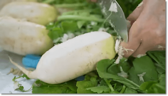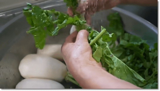손질을 끝낸 무는 흐르는 물에 깨끗이 씻어줍니다. 이파리 쪽에 흙이 있을 수 있으니 깨끗이 씻어줍니다.