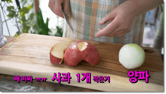 믹서에 갈아줄 재료들을 준비해서 갈아줍니다. 양념에 배가 들어가면 시원하고 달고 맛있는데, 배가 없으면 사과로 대신해도 됩니다. 사과 1개 작은 것 넣어주고, 양파 1개도 믹서에 넣어줍니다. 갈기 좋게 적당한 크기로 썰어서 넣으면 됩니다. 여기에 마늘 20알과 생강 엄지손 크기 한톨을 썰어서 넣고 같이 갈아줍니다.