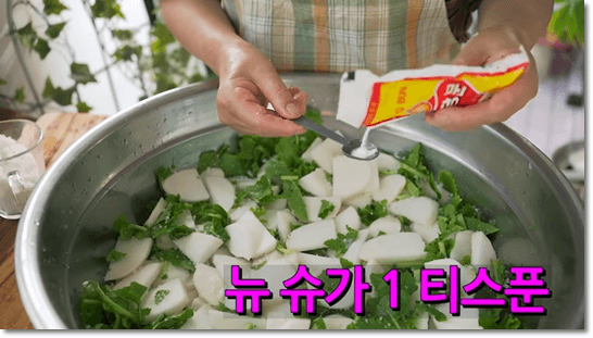 여기에 뉴슈가 1티스푼도 골고루 뿌려줍니다. 뉴슈가를 넣어주면 무가 아작아작 오독오독 아주 식감이 좋아집니다. 설탕을 넣으면 무가 질겨지니 뉴슈가를 넣어주는 것이 좋습니다.
