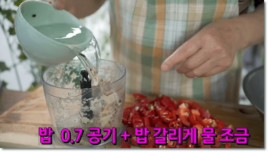 밥 0.7공기와 밥이 갈릴 수 있게 물도 조금 넣고 갈아줍니다. 밥 간 것에 고추와 파프리카를 넣고 커트커트해서 입자가 살아있도록 갈아줍니다. 너무 부드럽게 가는 것보다 커트커트 끊어서 갈아 입자를 살려주는 것이 좋습니다.