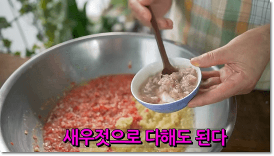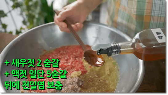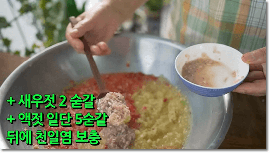 믹서에 갈았던 재료를 모두 부어주고, 새우젓 2숟갈을 넣어줍니다. 여름김치에는 새우젓을 넣어주면 시원한 맛이 나서 더 좋습니다. 액젓은 무거운 맛이 나는데, 액젓 대신 새우젓으로 모두 다 넣어도 괜찮습니다. 취향껏 선택해서 만들면 됩니다.