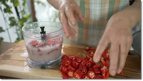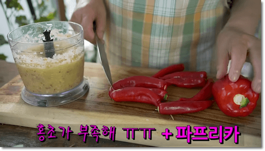 홍고추 10~12개 정도 넉넉히 준비하는데, 홍고추가 많이 들어가면 빨갛게 색도 잘 나고 청량감 넘치는 맛이 나서 여름김치에는 아주 잘 어울립닌다. 만약 홍고추가 부족하면 빨간 파프리카 1개를 같이 넣어도 좋습니다. 홍고추와 파프리카를 믹서에 갈기 좋게 적당한 크기로 미리 썰어 놓습니다.