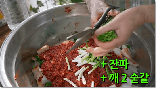 물기 뺀 무에 양념을 모두 넣은 후, 잔파 한 줌을 잘러서 넣어줍니다. 깨 2숟갈 같이 넣어주고 손으로 살살 버무려줍니다. 맛을 보고 간이 부족하면 천일염을 반숟갈 정도 더 넣어서 간을 맞춰 줍니다.