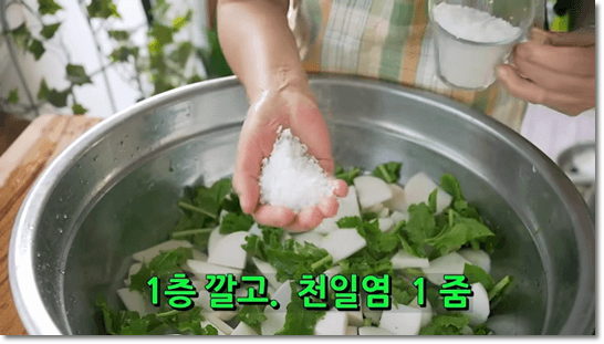 이제 무를 절여줍니다. 대야에 무와 줄기를 한 단 깔고, 천일염 1줌 뿌려줍니다. 또 한층 깔아주고 천일염 1줌을 더 뿌려줍니다. 총 2줌의 천일염이 들어갔습니다.