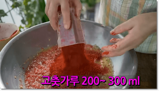 액젓도 5숟갈 넣어줍니다. 나중에 싱거우면 천일염으로 간을 보충해주면 됩니다. 고춧가루 200~300ml 정도 넣어줍니다. 고춧가루 양은 취향껏 양을 조절하면 됩니다. 골고루 잘 섞어주면 양념 완성입니다.