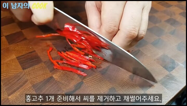 3) 홍고추도 같은 방법으로 가늘게 채 썰어줍니다.