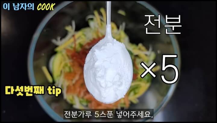 3) 전분가루 5스푼을 넣고, 버무려가며 반죽해 줍니다. 밀가루나 부침가루 대신 전분가루를 사용하면 테두리와 겉은 바삭하고 속은 쫀득하고 촉촉하게 만들어집니다. 겉바속촉 맛있는 애호박전을 만들려면 전분가루를 사용해보세요.